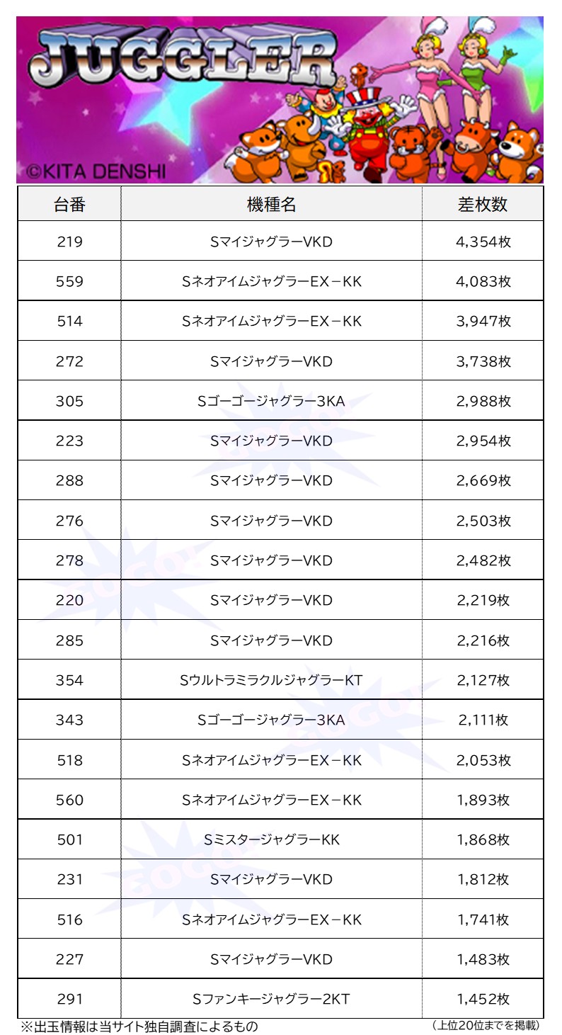ユーザー本命のマイジャグラーⅤとネオアイムジャグラーEXに好調台が目立つ結果に。